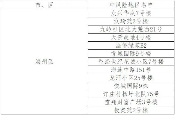根據(jù)國務(wù)院聯(lián)防聯(lián)控機(jī)制有關(guān)規(guī)定,經(jīng)綜合評(píng)估研判,市指揮部決定,自發(fā)布之日起,將龍河小區(qū)25號(hào)樓、悅城國際9棟、許莊村楊圩北隊(duì)75號(hào)、寶翔財(cái)富廣場3號(hào)樓、極美苑2號(hào)樓調(diào)整為中風(fēng)險(xiǎn)地區(qū)。