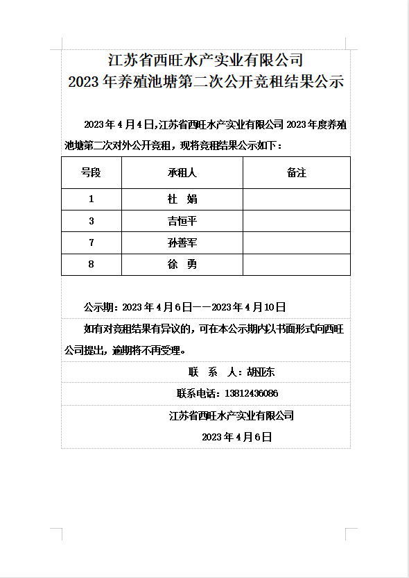 江蘇省西旺水產(chǎn)實業(yè)有限公司2023年養(yǎng)殖池塘第二次公開競租結(jié)果公示