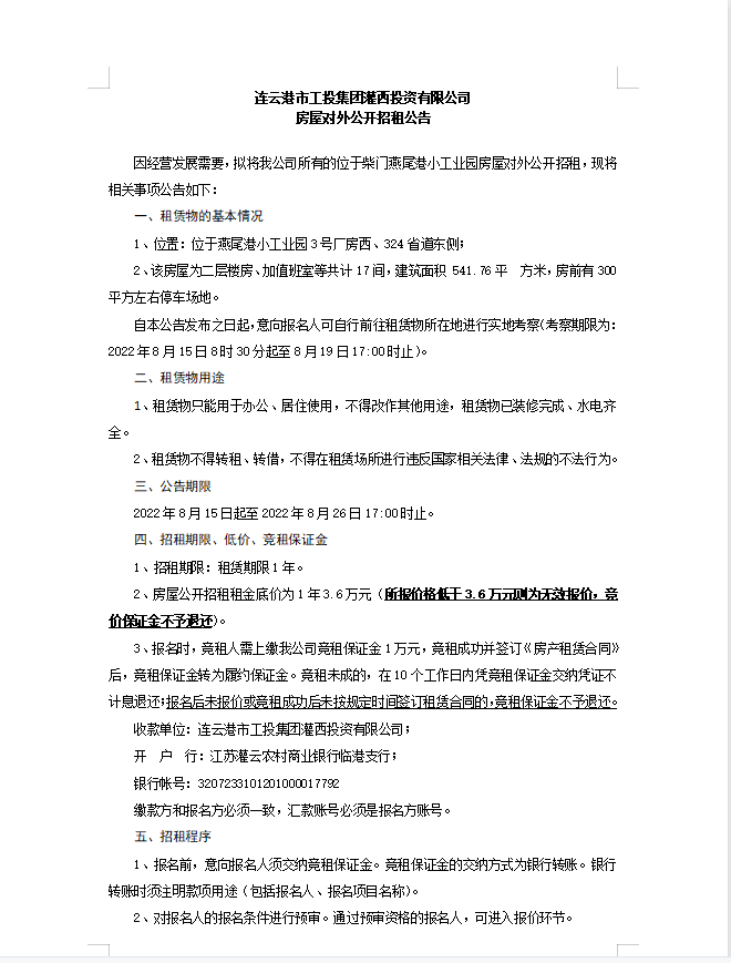 連云港市工投集團灌西投資有限公司房屋對外公開招租公告
