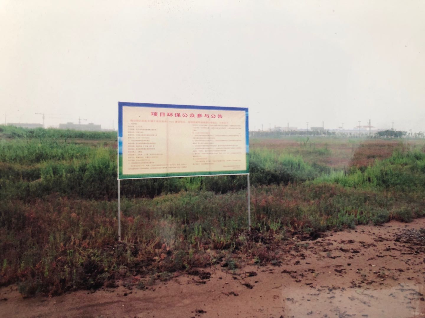這是神特公司籌建時期的環評現場公示照片,是2008年8月底拍攝的。照片的重點部分是一個大牌子——項目環保公眾參與公告的牌子,位置大約在現在一期傳達室附近。做這樣的牌子是當時環評的一個環節,必須在建設場地進行兩次公告,征求相關環境利益方的訴求。牌子的遠方隱隱約約看見有些工廠和電力桿塔,牌子附近生長著茂密的堿蒿,一團團一簇簇,忽高忽低,可以看出地面是很不平整的。當年豎牌子的時候,是雨后不久,地面較為泥濘,建設用地及周邊環境多多少少透射出一種蒼涼的感覺。