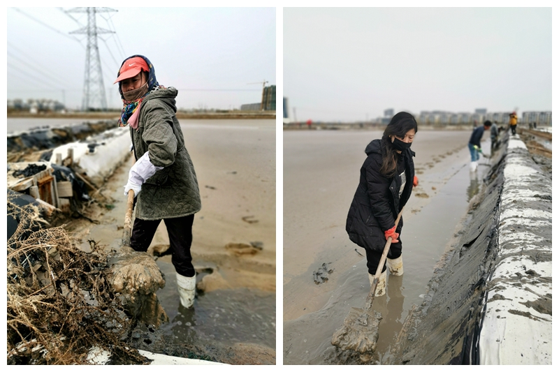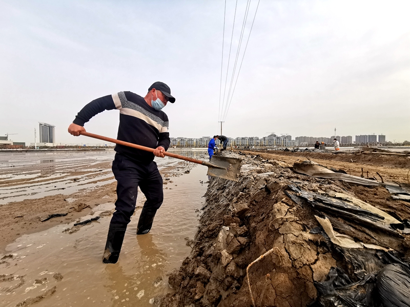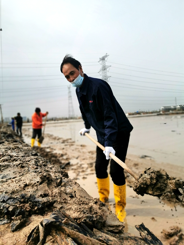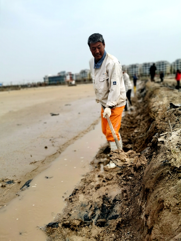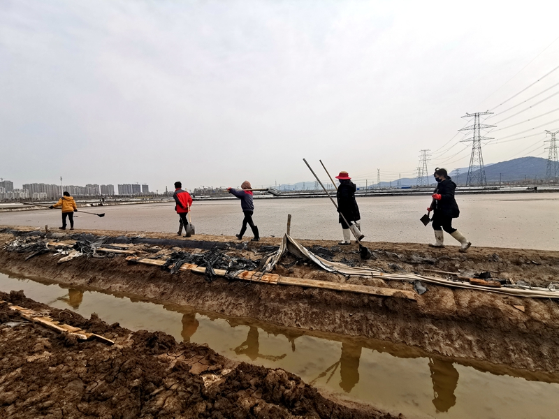 往東邊看,先鋒東灘黨旗招展分外鮮紅,海州灣公司18個單元職工、3名班組長全員出動馳援大浦工區(qū)協同重整410畝閑置鈣鹽灘地。引水入溝、翻泥上堰、腳踩和整、鐵掀蹋平,動作嫻熟。1200余米的10余條池堰僅用一天的就順利完工。